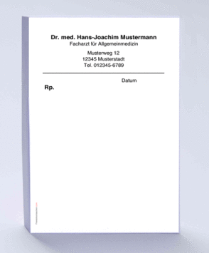 Ausführung: Format: DIN A6, Schriftbeispiel für Praxiseindruck: Dr. med. Hans Mustermann | Hier gelangen Sie direkt in unseren Shop